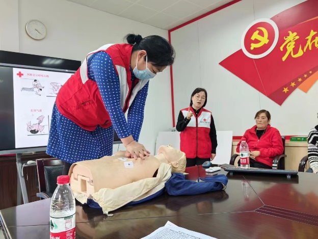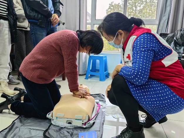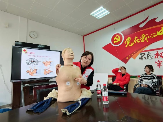 本次培训分为理论学习、理论考试和实操考核三个部分。救护培训讲师介绍了红十字会的起源和主要工作内容,并结合发生在身边的鲜活事例,通过现场示范的方式,生动讲解了心肺复苏、气道异物急救、止血包扎、骨折固定、伤员搬运和烧伤、冻伤、溺水、中暑、地震、狂犬咬伤等意外伤害的防护与救护方法,演示了心肺复苏术、海姆立克急救法和自动体外除颤仪(AED)的使用方法。