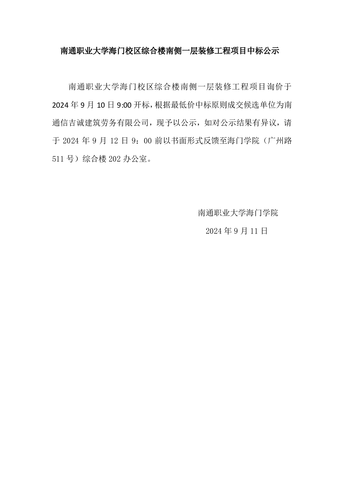 bv1946伟德官网海门校区综合楼南侧一层装修工程项目中标公示