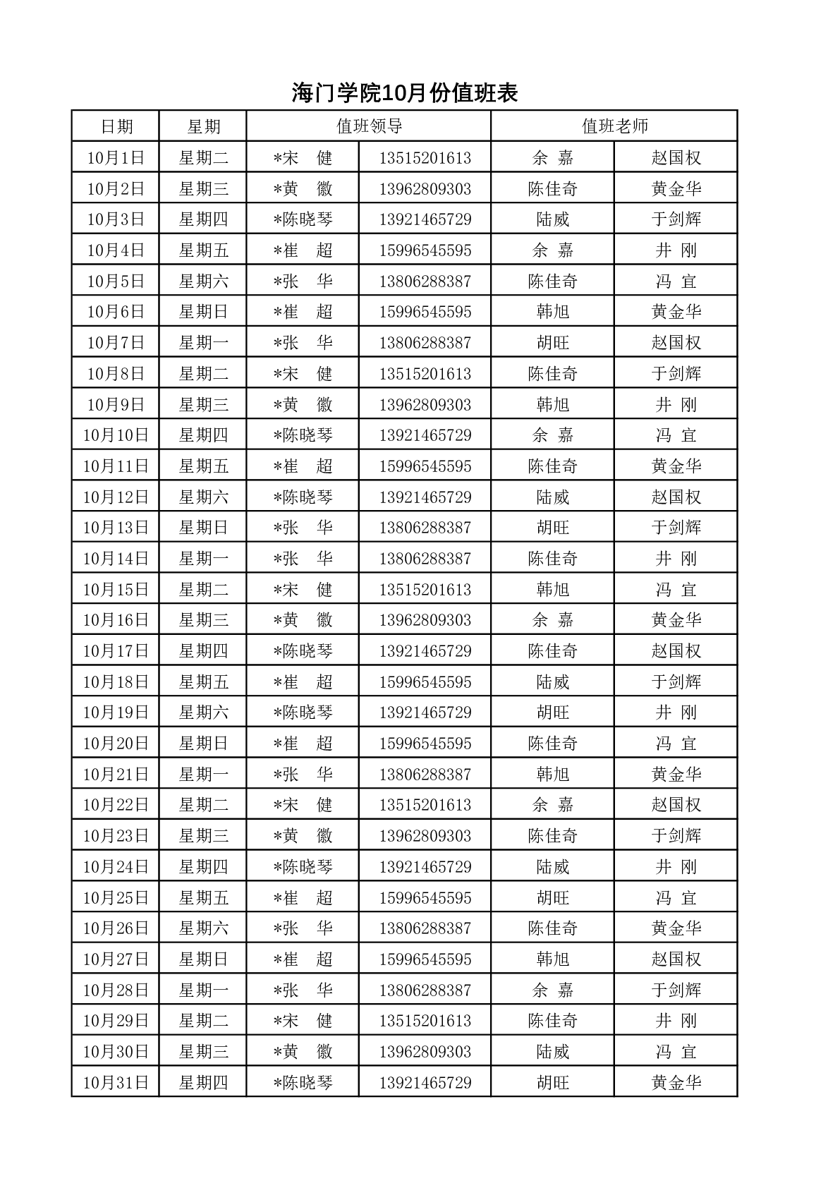 bv1946伟德官网10月份值班表